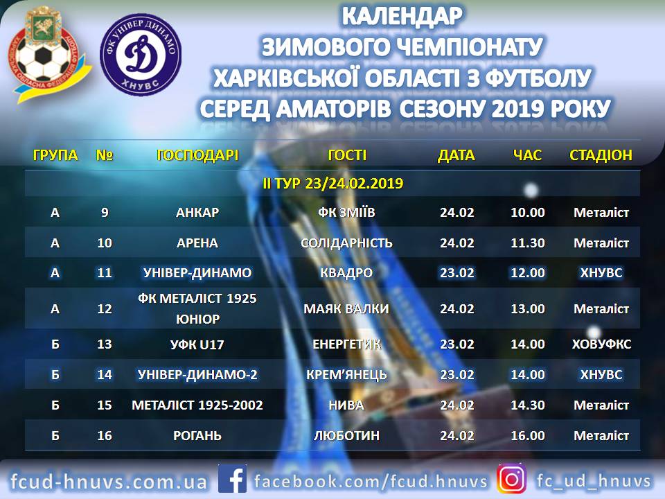 Вже цієї суботи дає старт Зимовий чемпіонат Харківської області 2019. Як і було зазначено раніше «біло-сині» приймуть в ньому участь двома складами. Вашій увазі пропонується розклад матчів за участю команд області. Перегони у двох групах «А» та «Б» триватимуть упродовж наступних семи тижнів після чого визначиться четвірка найсильніших команд, які і розіграють головний трофей - Зимовий кубок. Огляд матчів за участю наших команд буде дублюватись на сайті клубу та у соціальних мережах Фейсбук і Інстаграмм! Найцікавіше вже зовсім скоро!!! РАЗОМ ДО ПЕРЕМОГИ!!!